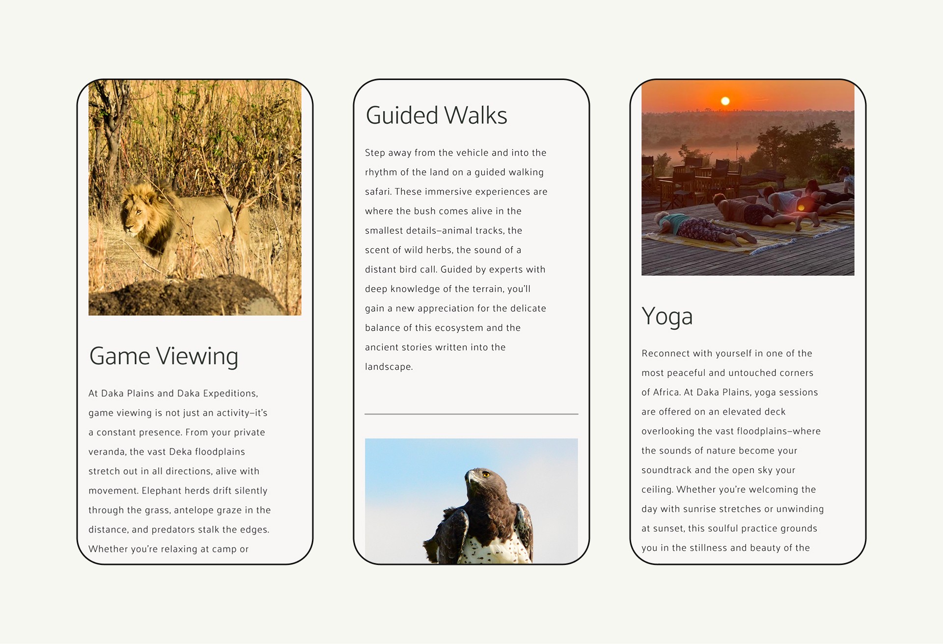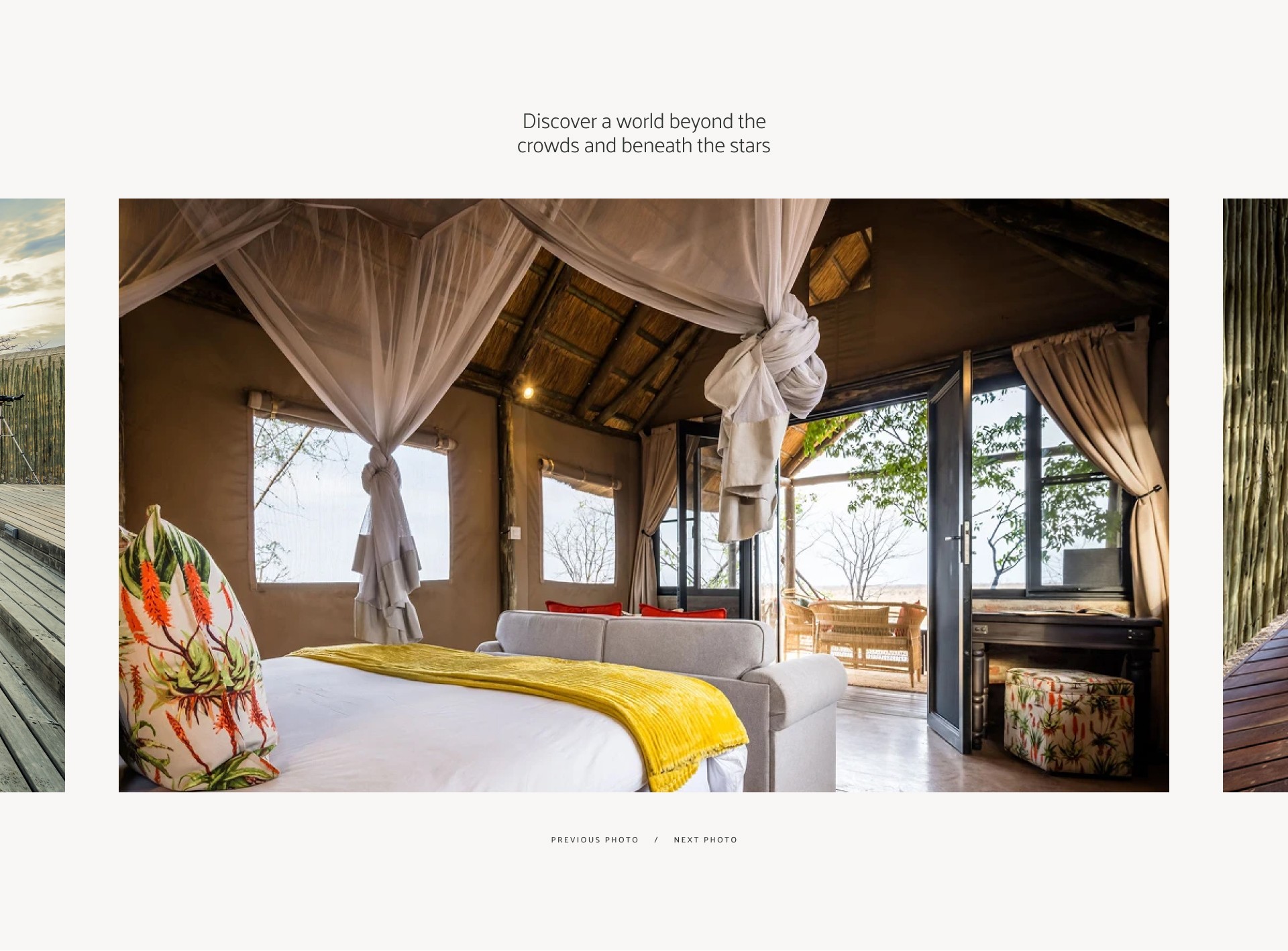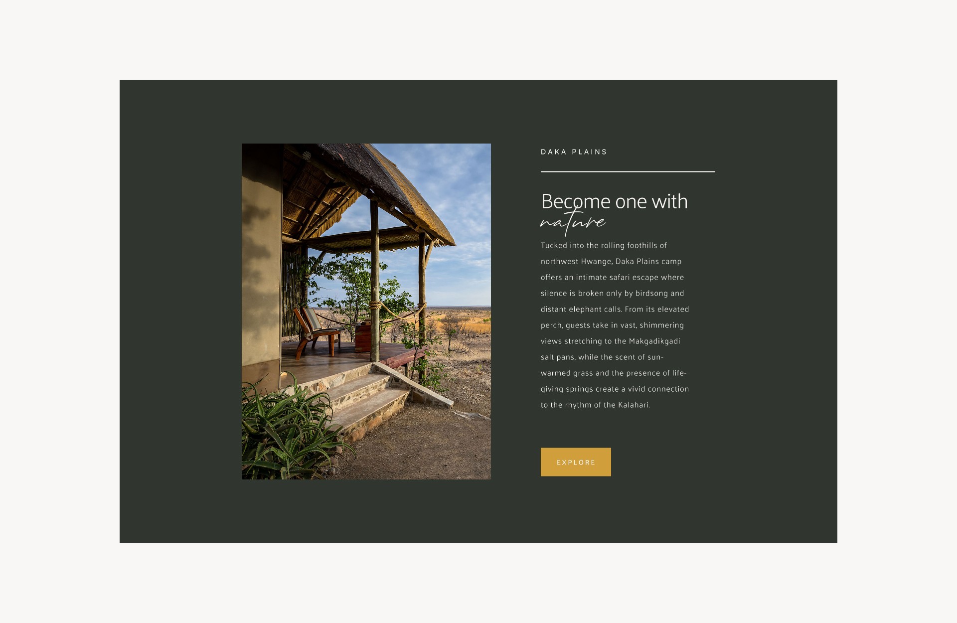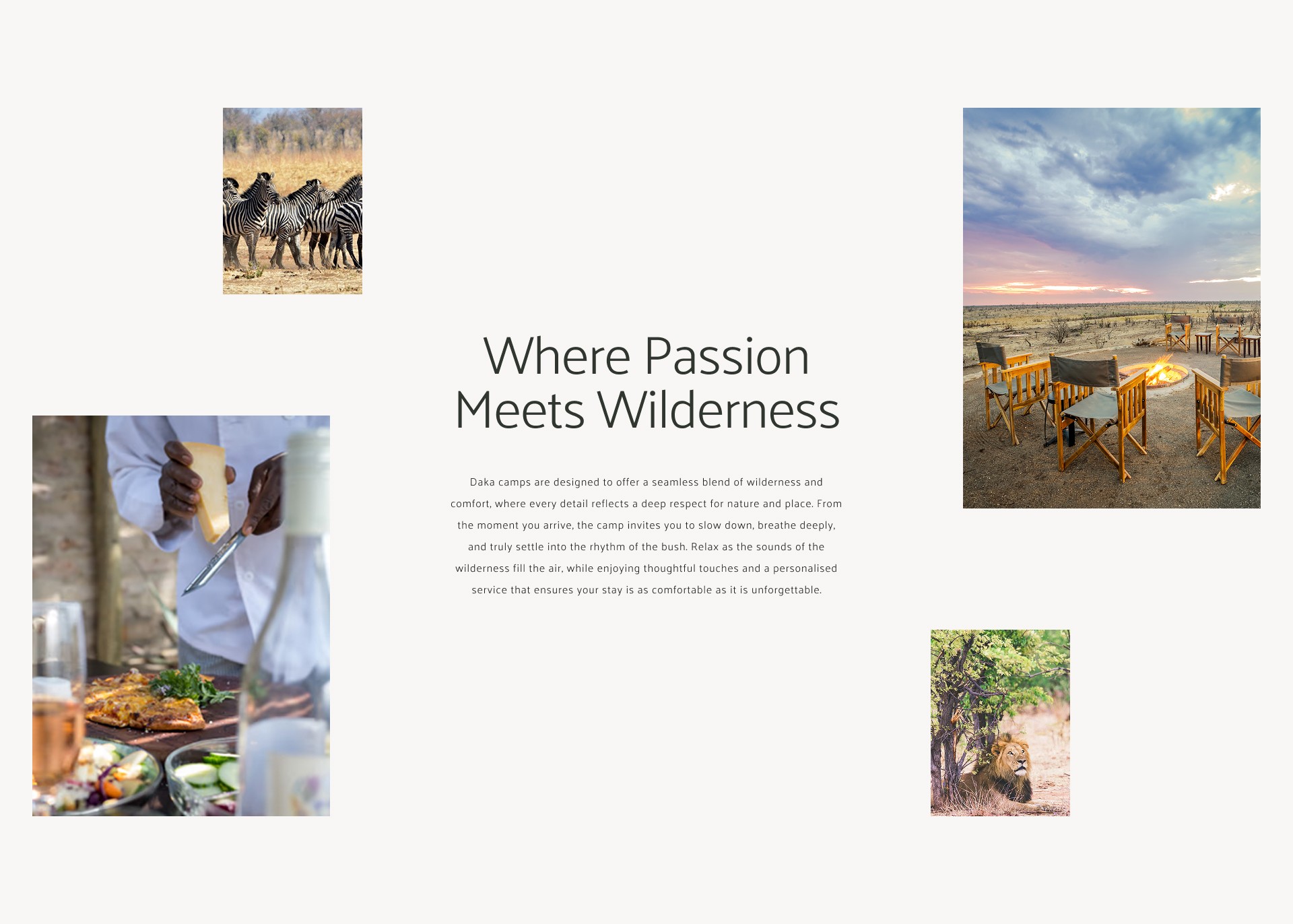 Daka needed a brand new website as part of a wider relaunch under new ownership. With restoration work underway at the camp and a major industry deadline approaching ahead of Africa’s Travel Indaba, the existing WordPress website no longer made sense to build on. It felt outdated, heavily templated, and too limited to reflect the new direction of the brand. Daka is positioned as a remote safari destination in Hwange, so the new site also needed to do a better job of bringing that sense of place, atmosphere, and experience to life online.