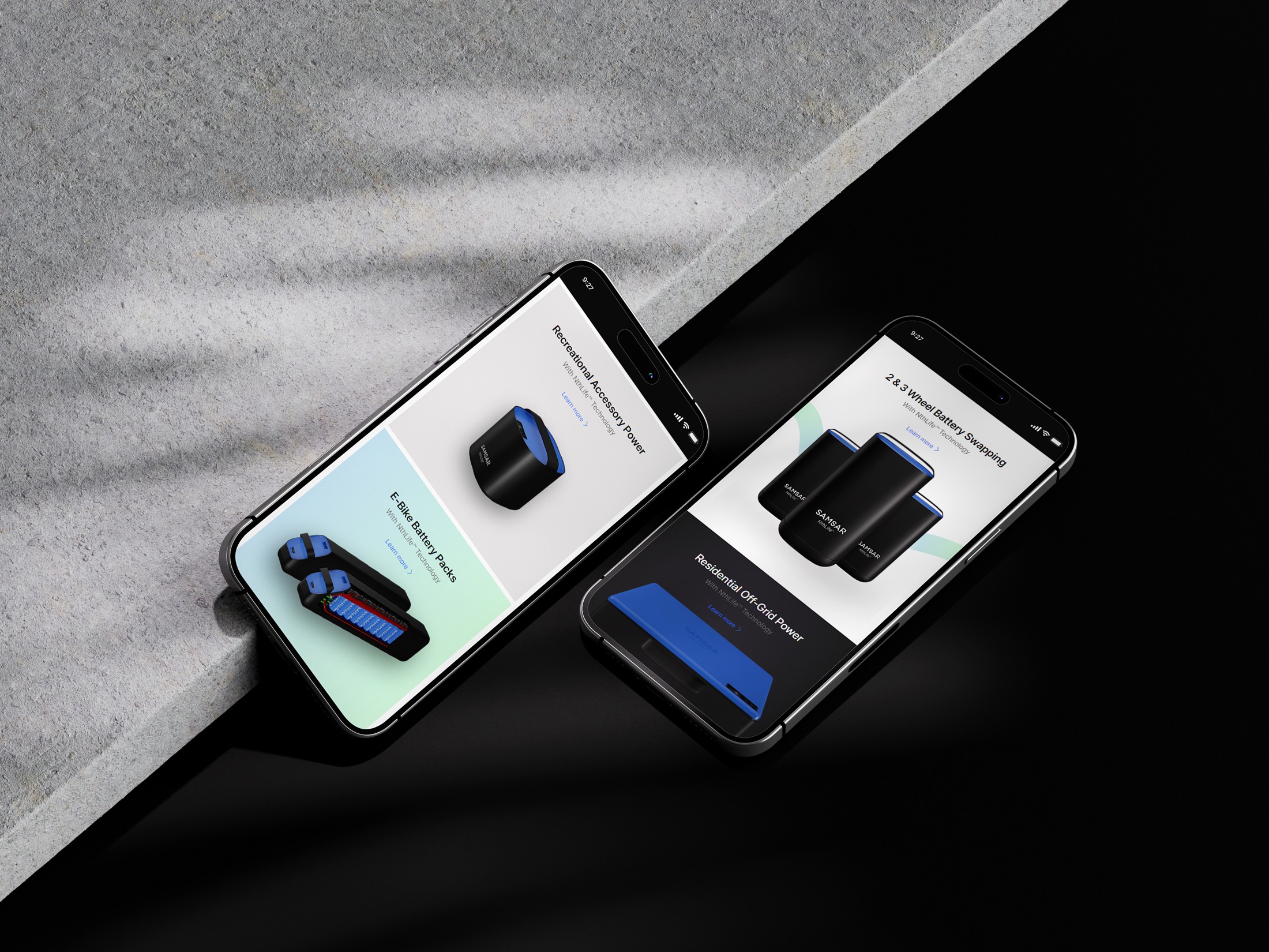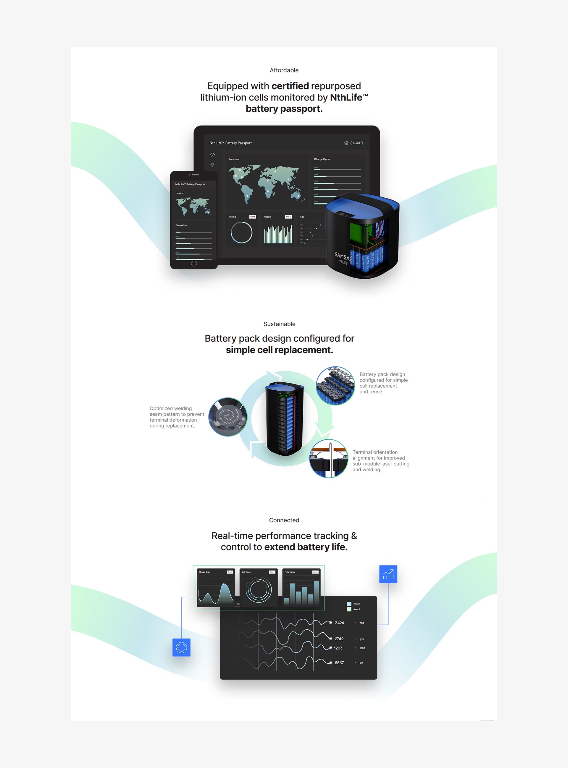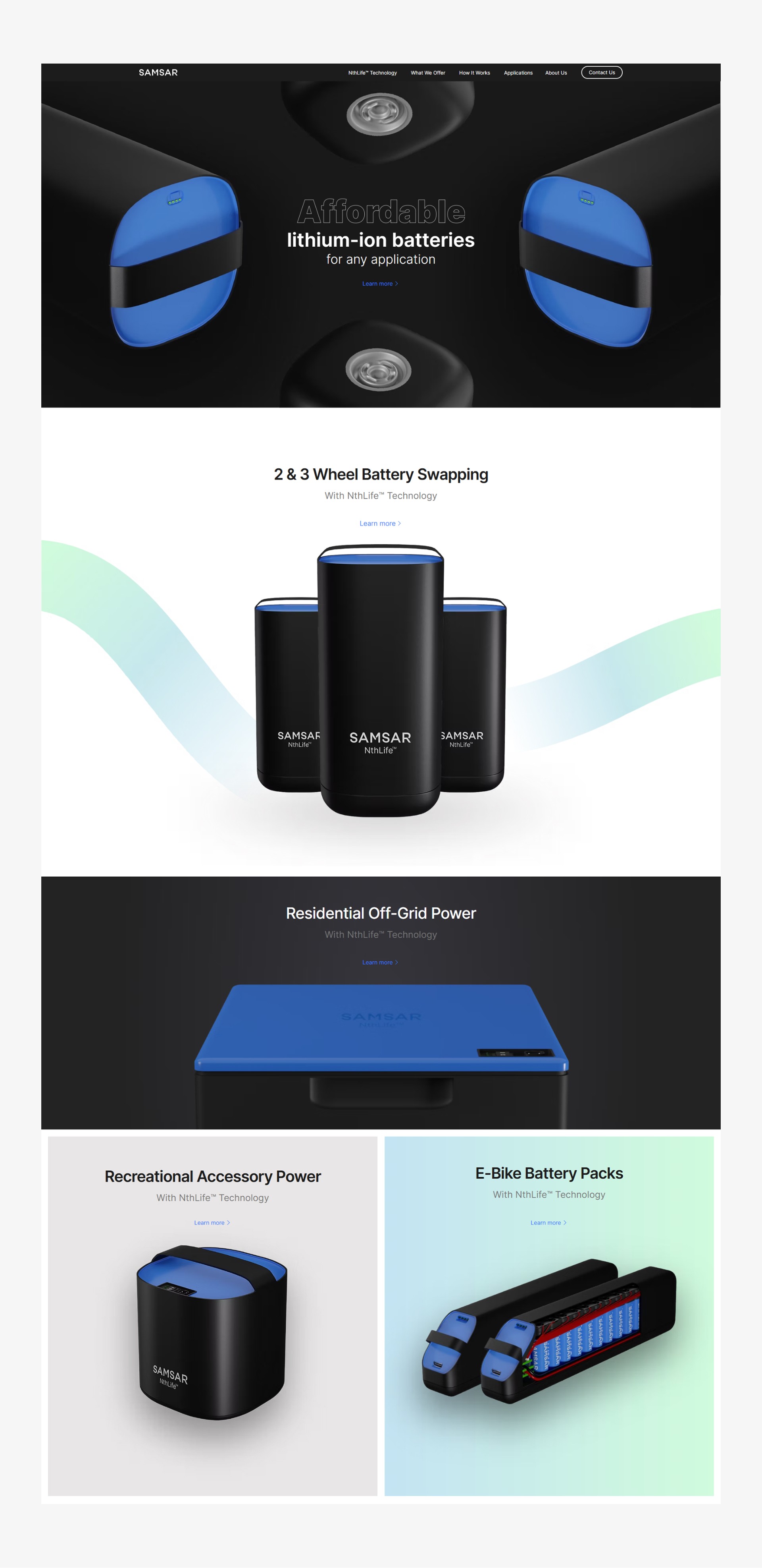 It also needed to support multiple layers of communication at once: the broader mission around circular economy and electrification, the role of NthLife™ technology, and the different ways the product could be applied across real-world use cases such as off-grid power, e-bike battery packs, and battery swapping. Alongside that, the brief called for an Apple-inspired direction with a cleaner, more polished aesthetic and a stronger sense of structure and restraint.